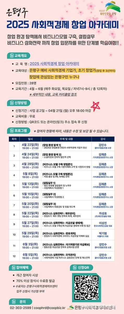 À̹ø ¾ÆÄ«µ¥¹Ì´Â â¾÷ Áغñ ½Ç¹« ¿ª·®À» °ÈÇϱâ À§ÇØ 12ȸÂ÷ °úÁ¤À¸·Î ¿î¿µµÈ´Ù. ±³À°°úÁ¤Àº â¾÷ȯ°æ Ž»ö, ºñÁî´Ï½º ¸ðµ¨ ±¸Ãà, ¼³¸³½Ç¹«, ºñÁî´Ï½º ½ÉÈ Àü·«°ú °°Àº 4°³ ¸ðµâ·Î ±¸¼ºµÆ´Ù.