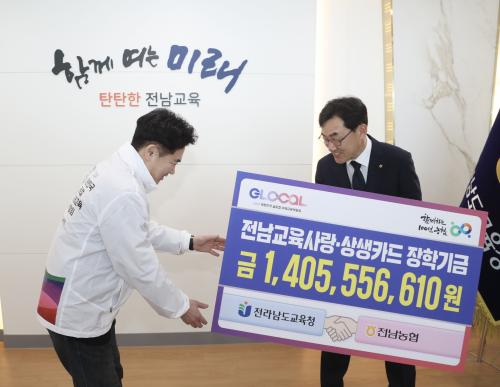 [È£ÅÚ°ü±¤·¹Á®½Å¹® Àü³²¿©¼ö=À̽ŵ¿±âÀÚ]Àü¶ó³²µµ±³À°Ã»ÀÌ 12ÀÏ(È­) NH³óÇùÀºÇà Àü³²¿µ¾÷º»ºÎ(º»ºÎÀå Á¤ÀçÇå)·ÎºÎÅÍ 14¾ï 555¸¸ ¿øÀÇ ¡®Àü³²±³À°»ç¶ûÄ«µå¡¤Áö¿ª»ó»ýÄ«µå ÀåÇбâ±Ý¡¯À» Àü´Þ¹Þ¾Ò´Ù. Àü¶ó³²µµ±³À°Ã» ºñÁî´Ï½º½Ç¿¡¼­ ¿­¸° À̳¯ Àü´Þ½Ä¿¡´Â ±è´ëÁß ±³À°°¨¡¦