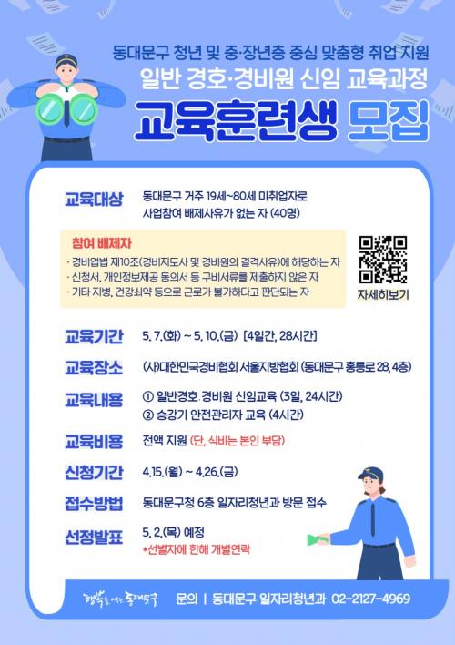 [È£ÅÚ°ü±¤·¹Á®½Å¹® µ¿´ë¹®=À̽ŵ¿±âÀÚ]¼­¿ï µ¿´ë¹®±¸´Â °æÈ£¡¤°æºñ¿øÀ¸·Î Ãë¾÷À» Èñ¸ÁÇϴ û³â~ÁßÀå³âÃþ ±¸Á÷ÀÚ¸¦ À§ÇØ ¡®ÀÏ¹Ý °æÈ£¡¤°æºñ¿ø ½ÅÀÓ±³À°¡¯ 1Â÷ Âü¿©ÀÚ¸¦ ¿À´Â 26ÀÏ(±Ý)±îÁö ¸ðÁýÇÑ´Ù. ÇØ´ç »ç¾÷Àº °æÈ£¡¤°æºñ¿øÀ¸·Î Ãë¾÷À» Èñ¸ÁÇÏ´Â ±¸¹Îµé¿¡°Ô ½ÇÁúÀû¡¦